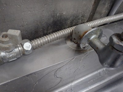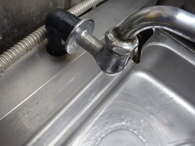 洗い場の水道から、音がして、水が吹き出しており、万事休す。