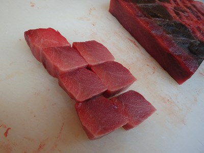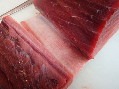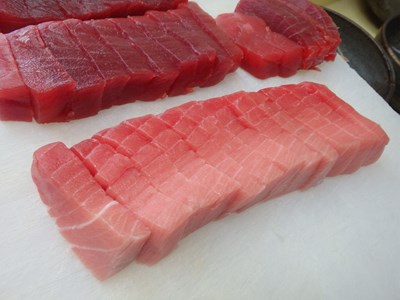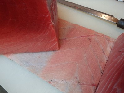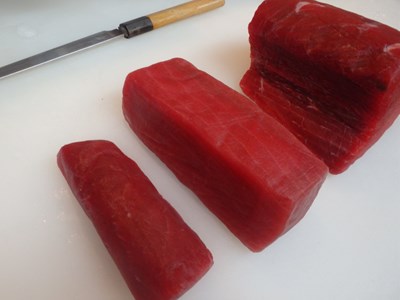お弁当用の生の本鮪の南蛮漬用に包丁し、
