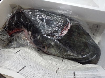 昨日お話ししましたように、三重県熊野灘産のジャンボちゃん(10,0キロ)こと、超特大の天然のとらふぐが届くことになっていたので、今朝は、