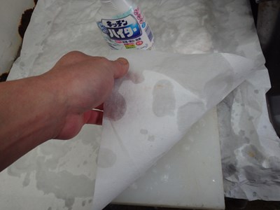 まな板に、ハイターを含ませたキッチンペーパーを乗せ、