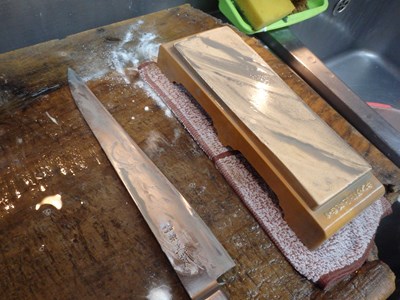 朝食兼小休止を終えたら、包丁を砥ぎ、