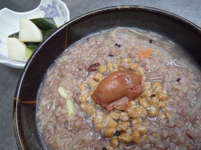 納豆、梅干し入りの雑穀粥を作り、朝御飯にしました。