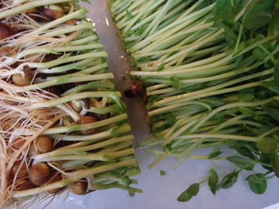 一方のかいわれ系は、茎が伸びるまで暗室で育て、その後たっぷり光をあてて緑化させるアブラナ科型のもので、これらだけでなく、暗室で発芽後、緑化させた中間型もあります。