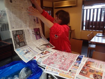 女将兼愛妻(!?)の真由美さんに、ふぐを卸すため、まな板周りを養生してもらいました。