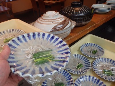 合間を見ながら、夜の御予約のふぐちりを盛り付けておきました。