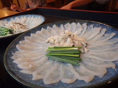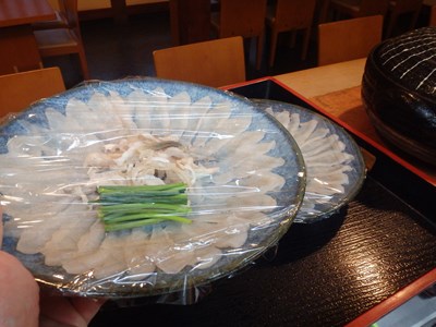 夕べのふぐは、全て天然のとらふぐでしたが、刺身は三重県熊野産、ふぐちりは熊野と福井県敦賀産、唐揚は敦賀産です。