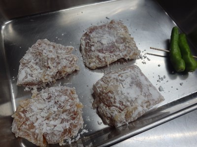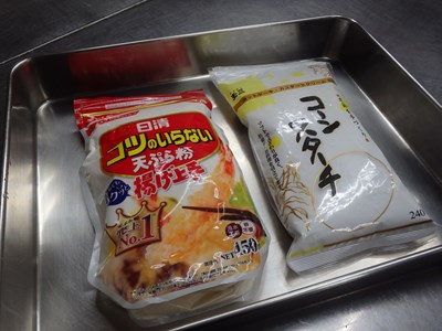 衣に使う粉も準備しておきましたが、『佳肴 季凛』で使っているものは、業務用ですので、一般の方が購入するのには、不都合ということもあり、普通に販売されている天ぷら粉とコーンスターチを使うことにし、コンスターチを使うのは、サクサク感を増すためです。