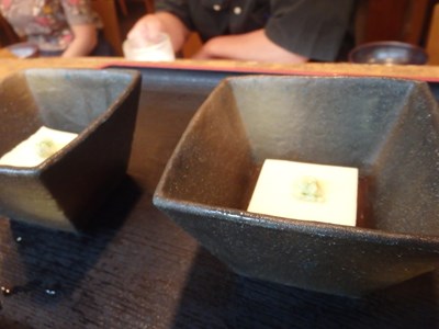 すぐに、御席をカウンターに御用意し、先付のもろこし豆腐や、
