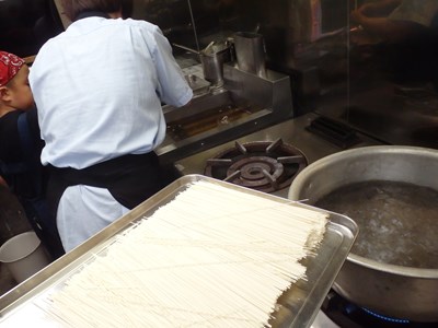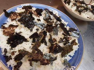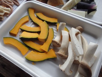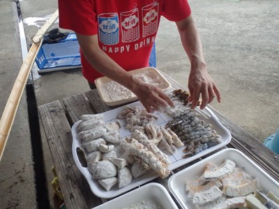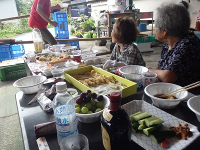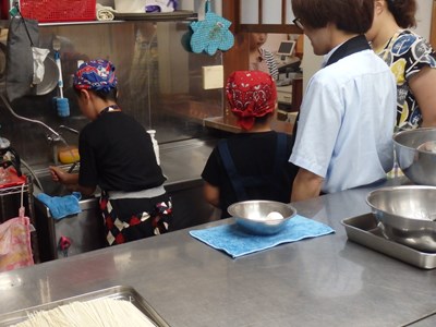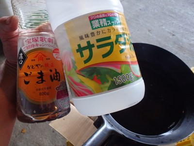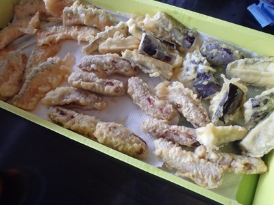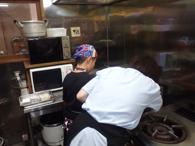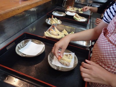 天ぷらを揚げている時、片方のお母さんから、大葉や海苔の揚げ方についての質問があったので、