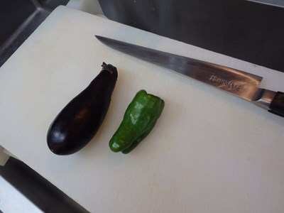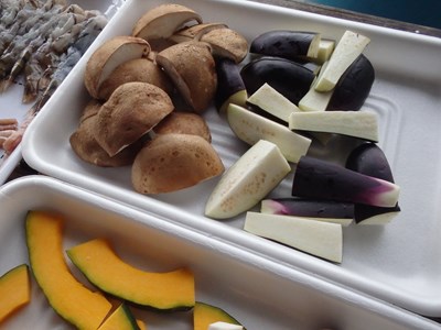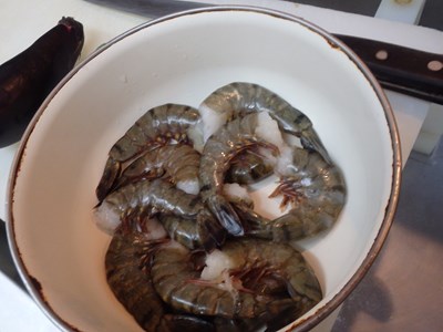 天種の王道とも言うべき海老を準備し、海老は皮を剥いてから、伸ばしてもらうため、このままで、茄子とピーマンは、切り方を説明したいので、