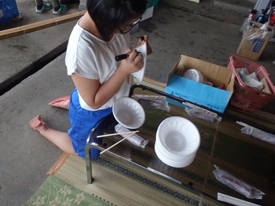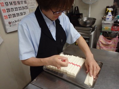 真由美さんが手を取りながら、油に入れるコツを伝え、