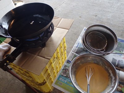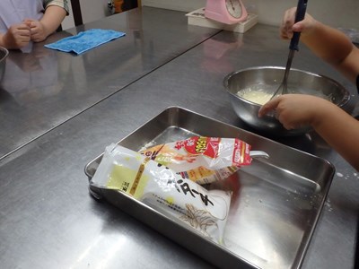 適当な硬さになるまで、卵、水、天ぷら粉、コーンスターチを混ぜ合わせてもらうと、案の定、お母さん達からの質問でした。
