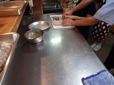 海老の皮を剥いたら、伸ばすために、自分が包丁目を入れたら、