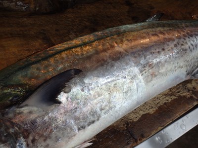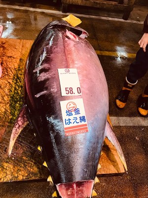 この塩釜産の生の目鉢鮪(58,0キロ)の魚体と、