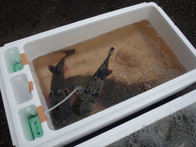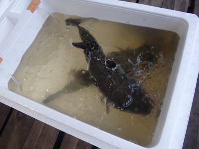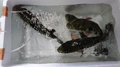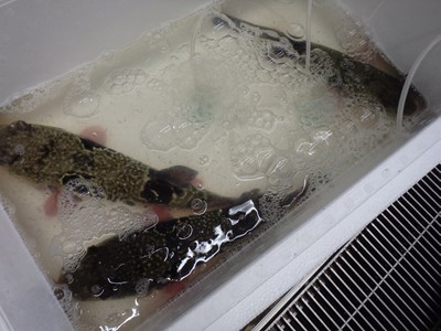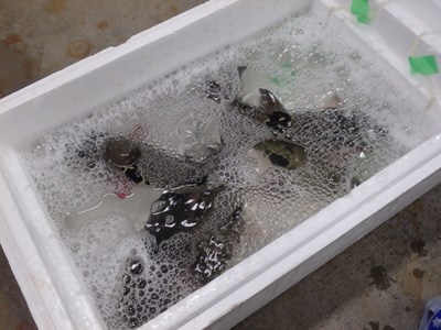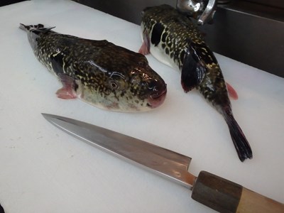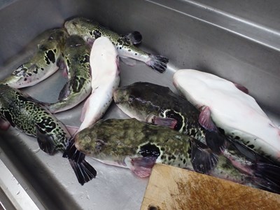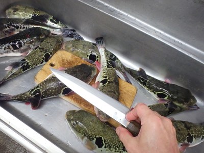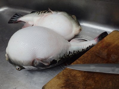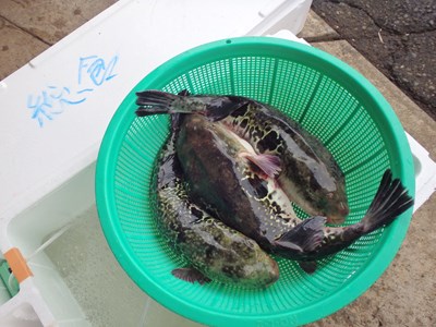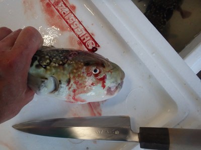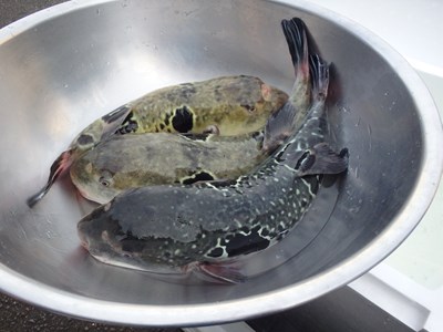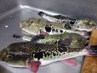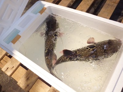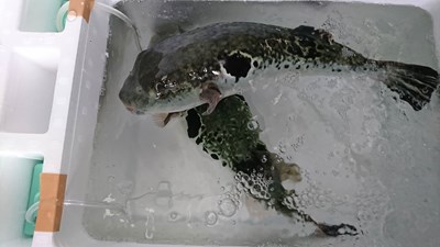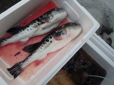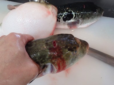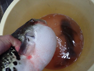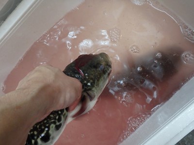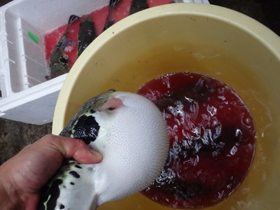 その後、活かして持ち帰ってきた3本のとらふぐを取り出し、