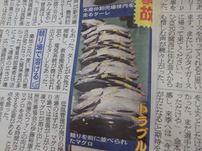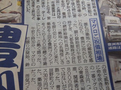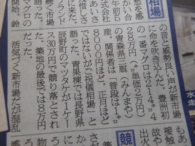 昨日の最高値で取引された青森県三厩(みんまや)産の生の本鮪のキロ単価(2万円)と1本の値段(428万円)のことが、書かれていました。