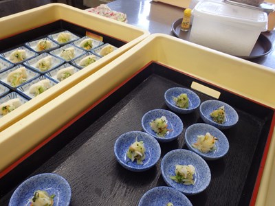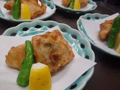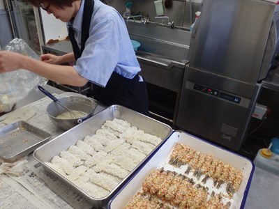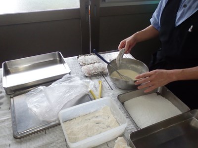 真由美さんは、揚物の海老と鯵に、衣をつけてくれました。