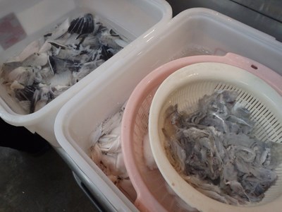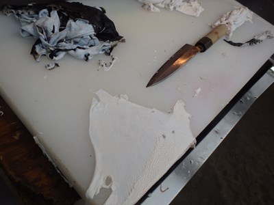 木曜日、金曜日、土曜日の3日間で卸した17本の天然のとらふぐの皮の棘取りをし、