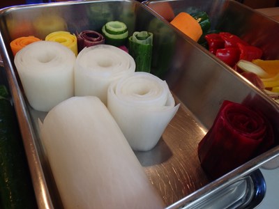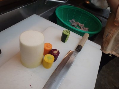 そして、刺身のつま用の大根、人参(オレンジ、黄、紫)、胡瓜、ビーツの桂剥きを終え、