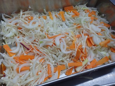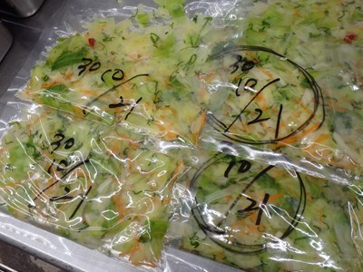 お新香にするため、キャベツ、人参、大葉を、昆布出汁、塩、薄口醤油で調味したものとともに真空パックしてくれ、それまでに、自分は、