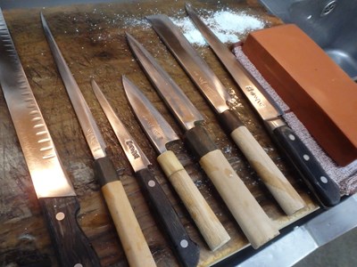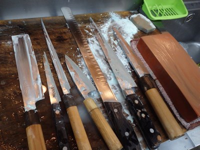 水に晒しておき、てんこ盛りの仕込みが終わり、最後に、包丁を砥ぎ、