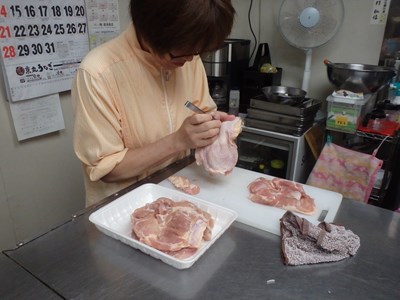 鶏の唐揚げにするため、もも肉の掃除をし始めました。