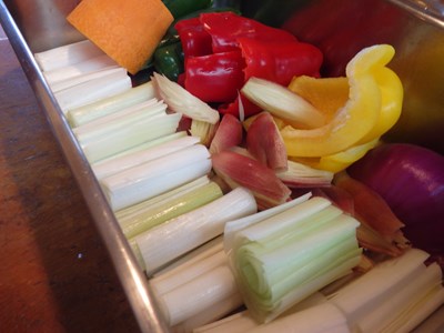 つまとサラダ素麺の野菜を包丁しておき、つまに使った野菜は先程お話ししましたが、サラダ素麺の野菜には、長葱、茗荷、ピーマン(緑、赤)、パプリカ(黄)、人参、アーリーレッド、レッドキャベツが入っています。
