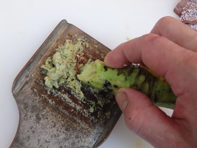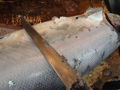 すき引きという方法で、包丁を使って、鱗を取ります。