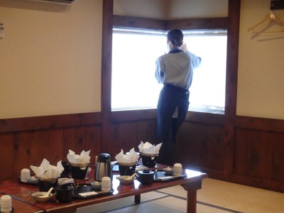 ホールスタッフの一人に、バスの到着を確認してもらうことにしました。