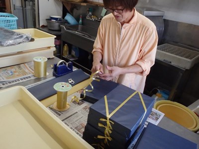 女将兼愛妻(!?)の真由美さんが包装してくれたのですが、法事のお返しの品として、来週発送するので、