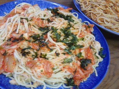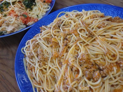 ミートソースの2種類作ったのですが、ミートソースは、女将兼愛妻の真由美さん(!?)が、先日多目に作っておいたものです。