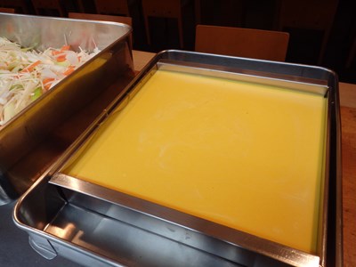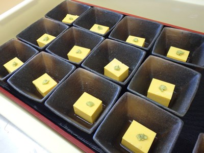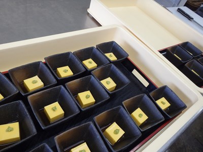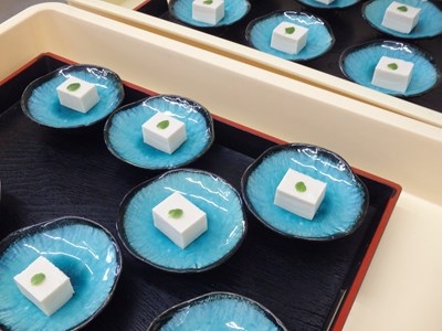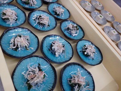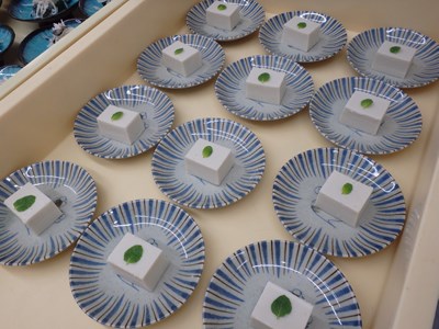 デザート(ココナッツミルクのムース)、酢の物(ふぐ皮の辛子酢掛け)と、最後にお出しするものから盛り付けたら、冷蔵庫にしまっていくのが、バスの時に限らず、団体の御席の時の盛り付け方です。