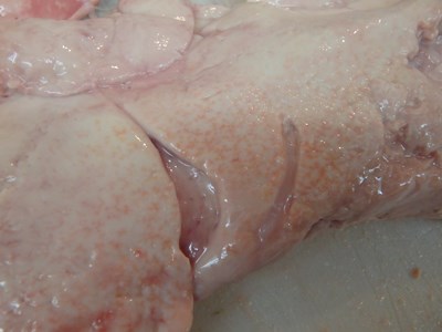 BIGちゃんやジャンボちゃんを刺身に仕立てると、この皮目の色だけなく、身の色の部分も濃く、