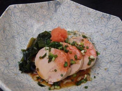 『真空調理で仕込む鮟肝(あんきも)』というお話しをしましたが、写真のように、ぽん酢ともみじ卸しでお出しするのが、一般的です。