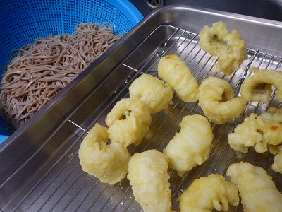 烏賊と帆立のかき揚げをはじめ、海老、鯵、南瓜、隠元、パプリカの天ぷらを揚げて、天ざるうどんにしました。