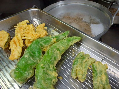 南瓜、万願寺唐辛子、隠元を天ぷらにし、天ざるそばにしました。