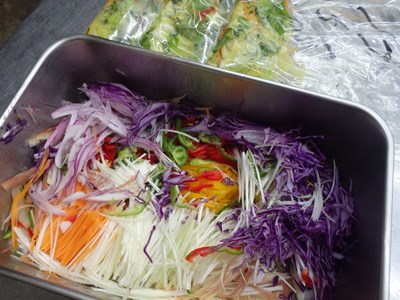 サラダ素麺の野菜を仕込み、サラダ素麺の野菜には、長葱、茗荷、茗荷竹、アーリーレッド、ピーマン(赤、緑)、パプリカ(黄)、人参、レッドキャベツが入っています。