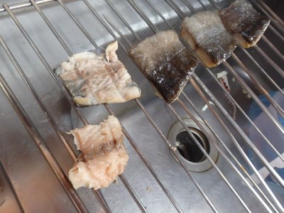 銀鱈はジェリーミートと呼ばれ、加熱すると身が溶けてしまう身質のものもあるので、切身にする前に、焼くようにしており、今日もそうしたのですが、